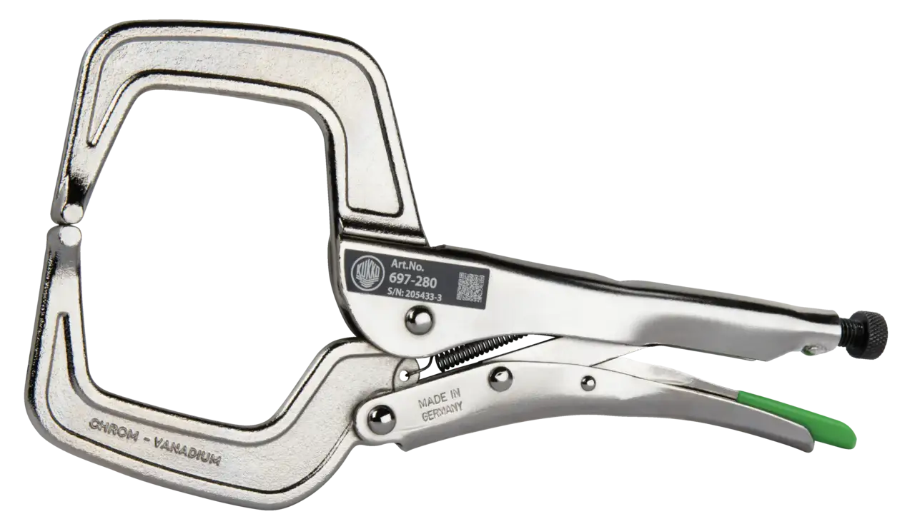 The clamping locking pliers of series 697 are used for clamping, holding and gripping profile and flat material in workshops, industry and craftsmanship. The locking pliers are not only handy and can be operated with one hand, but the lever mechanism also allows very high forces to be applied. The series 697 with its special shape can also clamp asymmetrical and bulky workpieces and profiles with high webs.