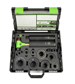 The 39-piece bearing installation tool set made of heavy-duty steel from the series 71 is used for the installation of bearings using a hydraulic press or hammer in crafts, industry, and workshops. The set includes 33 impact rings and 5 impact tubes made of extra strong steel, as well as 1 SELCTHOR with two different impact inserts (PU/CA). The tool set allows for a damage-free installation of bearings without damaging axles, bearing housings, or seal rings.