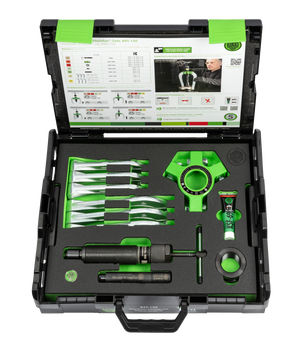 The 11-piece hydraulic "4 Puller" set with self-centering jaws is used for pulling bearings, gears, discs, etc. in crafts, industry, and workshops. The set includes pullers, hydraulic spindle, jaws, as well as 2-jaw and 3-jaw combo crossbars that can be combined into four different pullers through the easily interchangeable, multiple combinable individual parts.