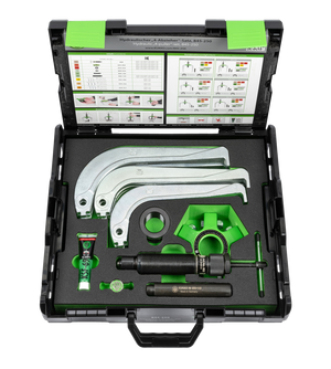 The 15-piece hydraulic "6 Puller" set with self-centering jaws is used for pulling bearings, gears, discs, etc. in craft, industry, and workshops. The set includes pullers, hydraulic spindle, hooks, as well as 2-jaw and 3-jaw combination crossbars that can be combined into six different pullers through easily interchangeable, multifunctional individual components.