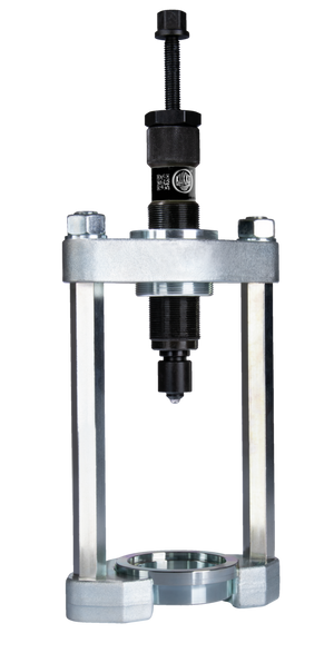 The universal press frames for silent bushings are used for axle changes on the front and rear axles in automotive applications without removing the axle, for example, for silent bearings, hydraulic bearings, plastic bearings, control arms or shock absorber rubber. The press frames of the series 880 are available in various designs for varying load requirements and can be used universally.