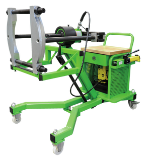 The mobile hydraulic separator "GOLIATH" is used for disassembling large bearings, gears, and similar components in heavy industry, railways, power plants, and other applications. With a pulling force of up to 50 tons, the "GOLIATH" is the solution for truly large pulling processes. The combination of hydraulic height adjustment and mechanical fine adjustment allows for easy and precise work. Only one person is required for the operation. The application of the pulling force on the pressure cylinder equipped with a central pressure spindle is performed by a two-stage electro-hydraulic pump, which is operated via a motor remote control.