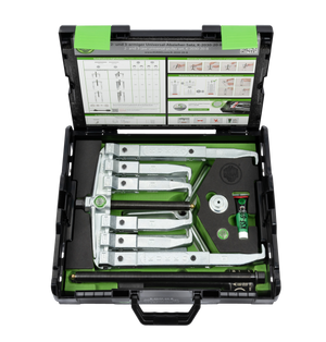 The 16-piece universal puller set from series 2030 is used for hydraulic, 2-jaw and 3-jaw pulling of large bearings, gears, disks, etc. in craft, industry, and workshop. The series 2030 impresses with its diverse combination options. The assembly set allows the combination of hydraulics, puller jaws, and extensions to create 14 different variants. The powerful design is particularly suitable for large and heavy applications in industry and commercial vehicles.
