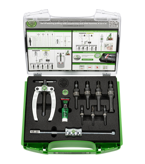 The 8883-piece ball bearing puller set with counter stay and sliding hammer K-22-C-E is used for extracting flush-mounted bearings, outer rings, and bushings in crafts, workshops, and industry. The segmented design with ultra-fine gripping edges allows for the safe extraction of flush-mounted parts. The included counter stay or sliding hammer is used together with the internal extractors, depending on whether sufficient support surface is available.