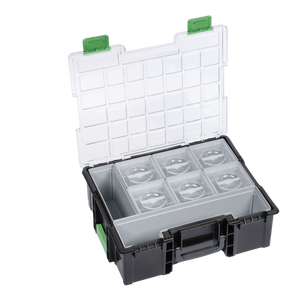 The KUKKO small parts case with high-impact polycarbonate lid on a solid base allows safe storage of small parts. The cases can be customized with insert boxes and/or dividers and can be securely connected with a connecting clasp.