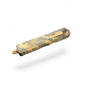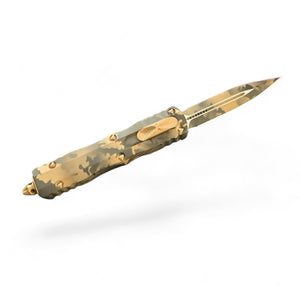 The Microtech Dirac D/E Signature Series Coyote Camo Standard 225-1 CCS is a sophisticated and highly functional double-action out-the-front (OTF) automatic knife. This model features a unique "Coyote Camo" pattern on its handle, blending shades of tan and brown, which not only gives it a distinct aesthetic but also enhances its appeal for outdoor and tactical use. The handle is crafted from high-grade aluminum, offering durability and a lightweight feel, which makes it easy to carry and maneuver.
