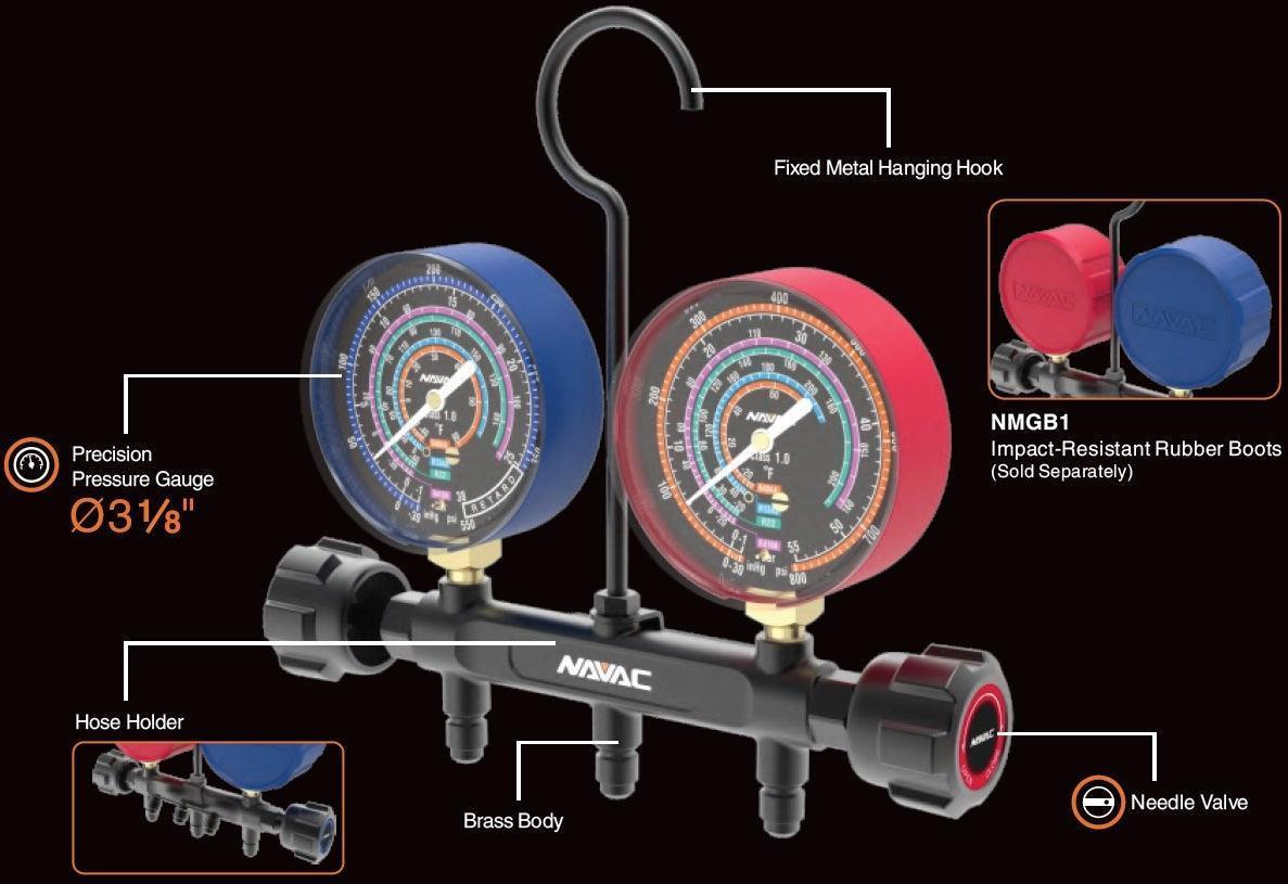 Meet the Pro Manifold Gauge – your straightforward, reliable companion for pressure measurement. Built tough with a brass body and needle valve, it ensures durability and efficiency for a better work experience. Its large dial, color-coded for easy reading, and precision pressure gauge makes it a practical choice for professionals. The gauge comes with user-friendly features like glow-in-the-dark elements, hose holders, and a hanging hook. Additionally, the inclusion of a rubber boot NMGB1 (Sold separately) offers added protection, safeguarding your investment against accidental bumps and knocks.