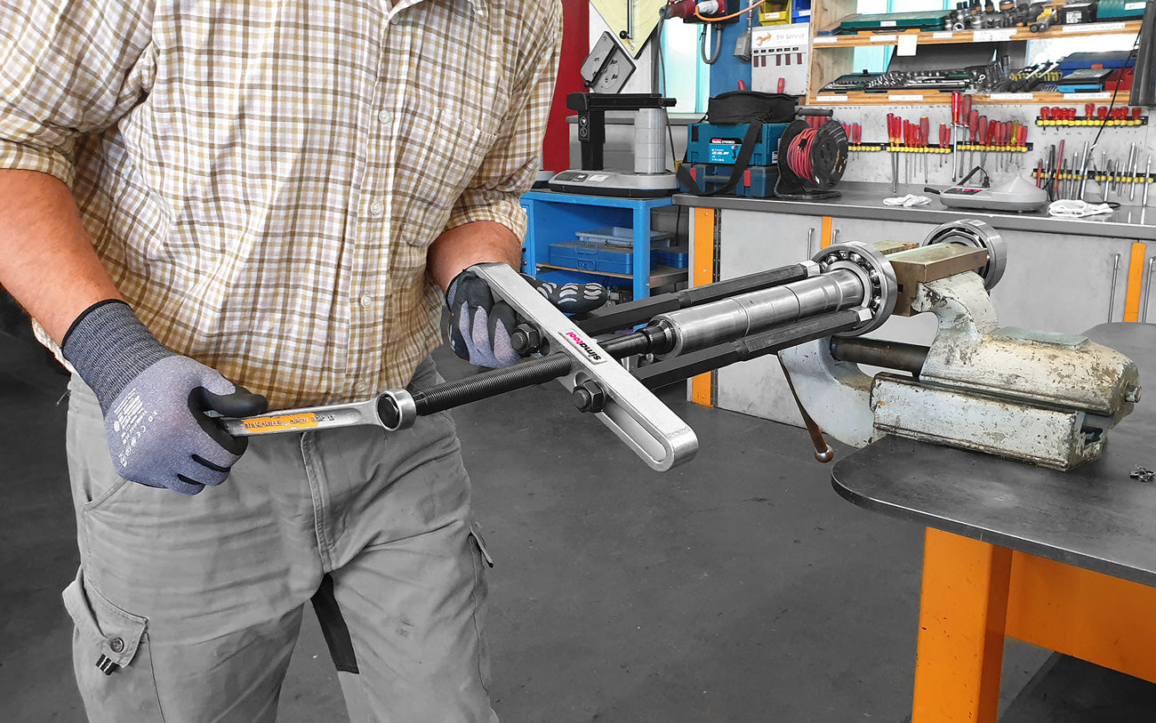 The BP 160 Bearing Puller enables the professional removal of deep groove ball bearings. Sealed bearings can also be removed after the corresponding seal has been removed. The ball adapters of the pull rod are inserted in the bearing race and then rotated by 90 degrees to ensure a secure hold. The BP 160 Bearing Puller makes it possible to remove more than 50 different deep groove ball bearings, with an inner diameter of 30 to 160 mm.