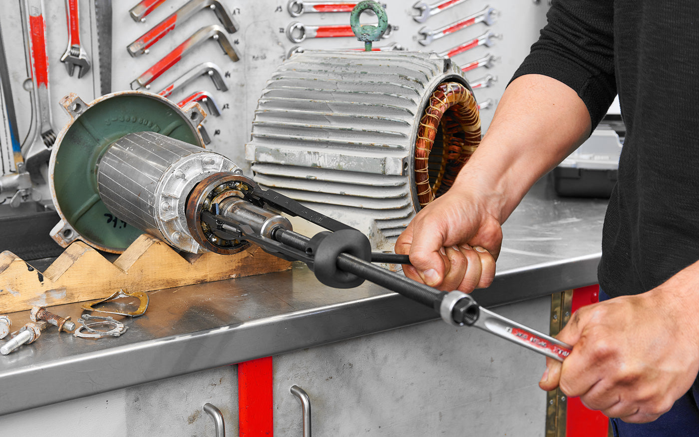 The simatool Twin Puller TP 150 can be used to expertly dismount deep groove ball bearings and radial shaft seals. Bearings with a tight fit on the inner or outer ring can be quickly and reliably dismounted with the help of this tool. The TP 150 can also be used to dismount shaft seals, thus making it a unique and professional dismounting tool.