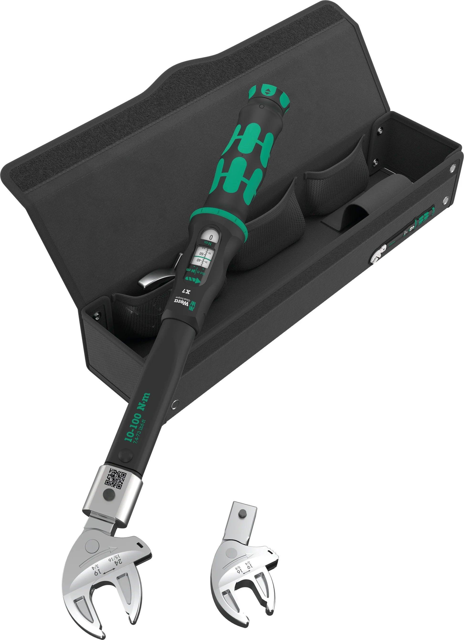 4-piece Click-Torque torque wrench set with three self-setting exchangeable Joker insert spanners. For the proper tightening of screw connections when installing and repairing refrigeration and air conditioning systems as well as heat pumps. Click torque wrench in the distinctive Wera design. Very robust design with high accuracy as per DIN EN ISO 6789-1:2017-07. Easy setting and saving of the default value. The audible and tactile clicks on reaching the scale values facilitate the safe setting of the desired torque value. The robust release mechanism guarantees a clearly audible and tactile release signal when the set torque value is reached. For clockwise and anti-clockwise torque-control and with 14x18 mm square head insert for mounting corresponding insert tools. With its continuous and parallel jaws, the three self-setting Joker 7880 insert spanners replace several single spanner sizes. The required size is automatically and continuously set when attaching the tool to the hexagon bolt or screw. The ratchet feature ensures fast and consistent screwdriving without removing the tool. By using the corner-width rectangular prisms, a return angle of only 30° can be achieved.